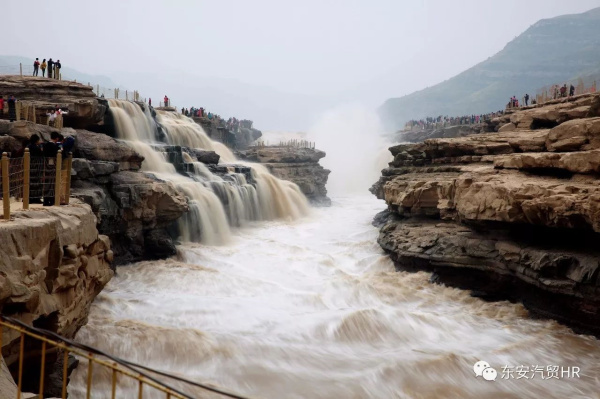 經(jīng)過近三個小時的車程,參加本次學習活動的同志們終于來到了氣勢磅礴的壺口瀑布。面對眼前的壺口瀑布,每個人心中頓時感慨萬千!黃河至此,兩岸石壁峭立,河口收束狹如壺口,在不到500米長的距離內(nèi),從上游300多米寬的水面壓縮到20-30米的寬度,1000立方米/秒的河水,從20多米高的陡壁上傾注而瀉,形成了“千里黃河一壺收”的氣概。千里黃河一壺收,只有現(xiàn)場領略了壺口瀑布的風采之后,才能體會到如此氣概。在參觀了延安之后,再來到壺口瀑布,一種責任感、使命感和自豪感在大家的內(nèi)心油然而生。